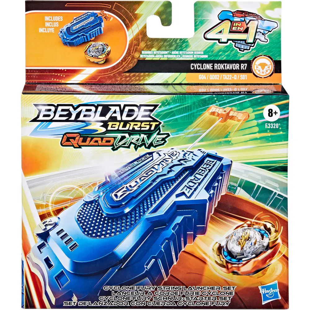 Mit Beyblade QuadDrive findet die Zukunft des Beyblade Battles mit den allerersten 4-in-1 Beyblade Kreiseln statt. Jeder QuadDrive Kreisel kann auf 4 verschiedene Arten konfiguriert werden. So hat der Spieler 4 Gelegenheiten, eine Strategie zu entwickeln, 4 Möglichkeiten zur Individualisierung, 4 Modi zum Battlen und 4 Chancen, um zu gewinnen! Das Cyclone Fury Schnur-Starter Set enthält 1 Cyclone Fury Schnur- Starter und 1 rechtsdrehenden Kreisel Cyclone Roktavor R7 G04 QD02 TA22- Q S01. Dank des Schnur-Starters können schnelle Starts ausgeführt werden, ohne eine Reißleine einlegen zu müssen. Einfach den Schalter am Starter bewegen, um zwischen rechts- und linksdrehend zu switchen. Für den Angriffs-Typ kann der Kreisel für die Modi Core und Expert und für den Ausdauer-Typ für die Modi Core+ und Expert+ konfiguriert werden. In der QuadDrive Beystadium-Arena (separat erhältlich) gilt es dann, sich die Power der QuadDrive Technologie zunutze zu machen. Durch das Scannen des Codes kann der Kreisel für ein virtuelles Battle in der Beyblade Burst App freigeschaltet werden. Mit Beyblade Burst Beystadium-Arenen, Startern und Kreiseln finden spannende Kopf-an-Kopf Battles statt, wenn es darum geht, seinen Weg zum „Beyblade-Meister“ zu ebnen. (Jeweils separat erhältlich. Je nach Verfügbarkeit.) Hasbro and all related terms are trademarks of Hasbro, Inc.