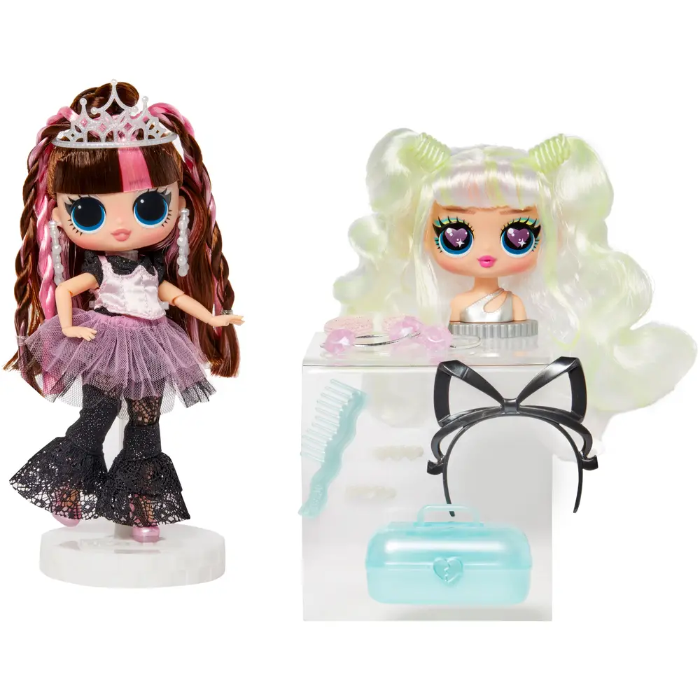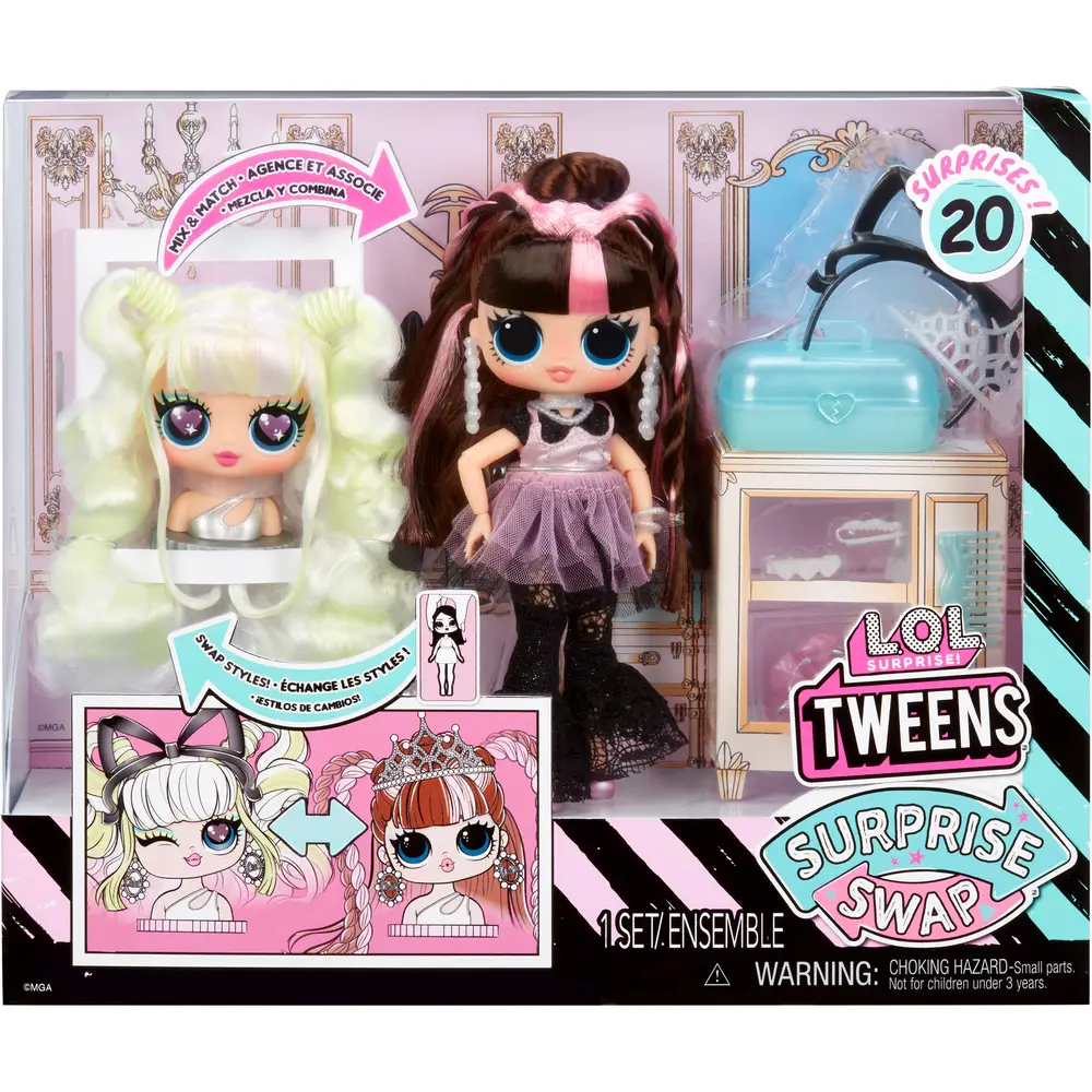 Die L.O.L. Surprise Tweens Surprise Swap Modepuppen kommen mit einem zusätzlichen austauschbaren Mini-Frisierkopf. Beide Köpfe haben lange Haare zum Stylen mit komplett unterschiedlichen Stylings. Die 2-in-1 Modepuppe kommt mit einem coolen Outfit und zahlreichen Styling-Zubehör, um eigene Looks zu kreieren. Ca. 17 cm. Ab 5 Jahren.