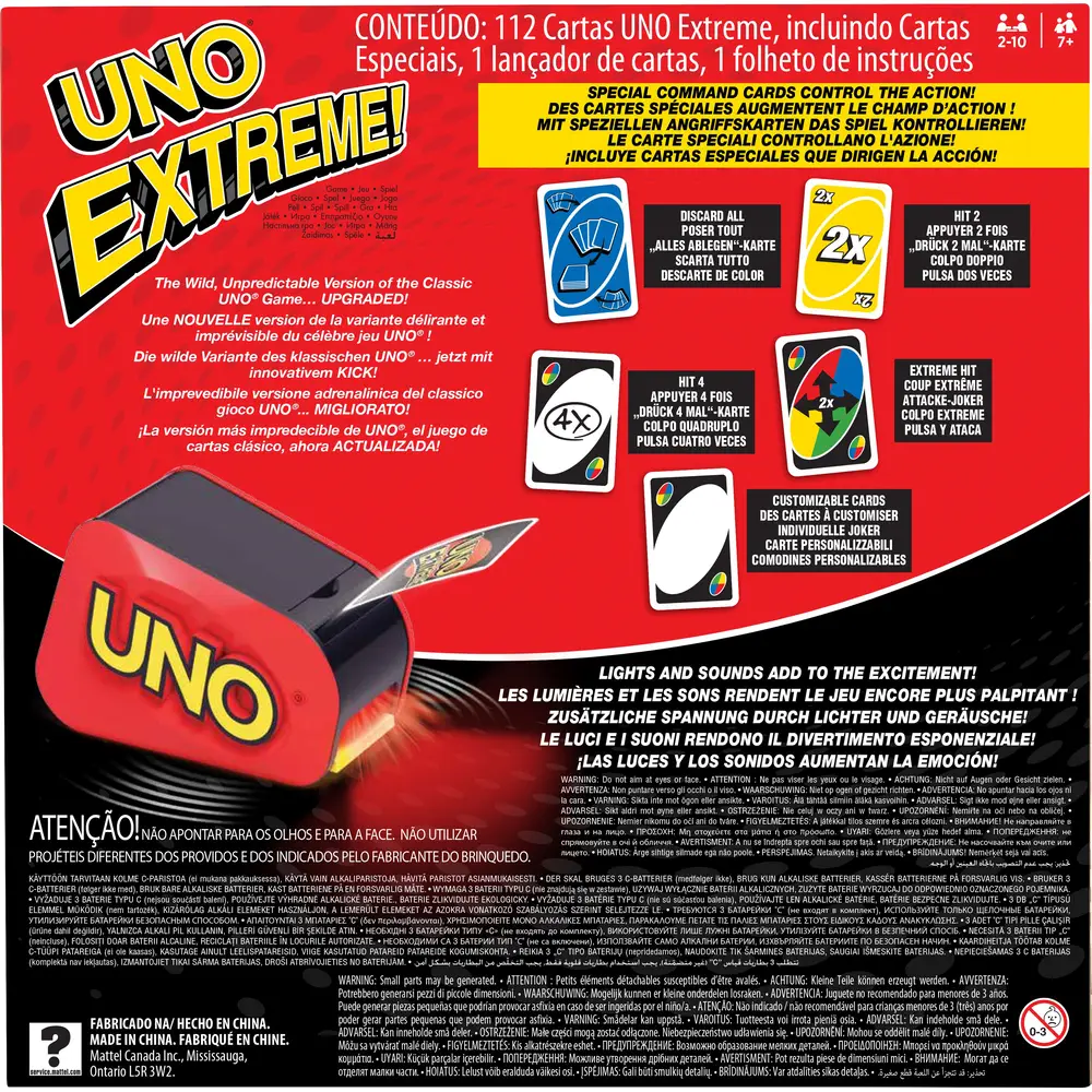 UNO wartet mit einer actiongeladenen, aufregenden Spielvariante auf. Wenn ein Spieler die Aktionskarte „Angriff“ zieht, dann muss er auf die elektronische Kartenschleuder des UNO Extreme-Spiels drücken. Wenn er Glück hat, passiert nichts. Wenn er aber kein Glück hat, muss er den UNO Extreme-Kartenschwall in sein Blatt aufnehmen. Dabei gibt die elektronische Kartenschleuder eine Vielzahl von Geräuschen aus, die das Spiel noch aufregender machen. Die Karten lassen sich perfekt in der Schleuder aufbewahren und für Spielspaß unterwegs einfach mitnehmen. Das Ziel bleibt nach wie vor, alle Karten als Erster abzulegen. Ganz wichtig: Wer nur noch eine Karte auf der Hand hat, muss „UNO!“ rufen. Enthält 112 Karten, eine Kartenschleuder und eine Spielanleitung. Für 2 bis 10 Spieler/Spielerinnen ab 7 Jahren. Abweichungen in Farbe und Gestaltung vorbehalten.