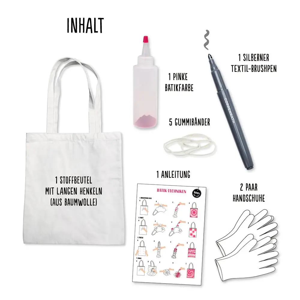 Wunderbar einfach lässt sich die Tasche in ein Unikat verwandeln: die Schritt-für-Schritt-Anleitung zeigt, wie schöne Batik-Muster entstehen und sich ein toller handgeletterter Spruch aufbringen lässt. Im Set enthalten sind 1 Tasche, 1 pinke Batik-Farbe, 5 Gummibänder, 2 Paar Schutzhandschuhe, 1 Brushpen und Anleitung