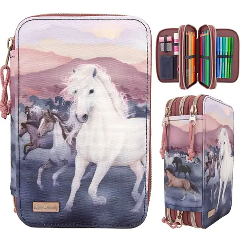 Traumhafte Pferde rundherum: Die 3-Fach-Federtasche von Miss Melody mit dem wunderschönen XL-Herden-Motiv vor stimmungvollem Abend-Himmel in Lila- und Mauve-Tönen ist komplett gefüllt mit je 18 Bunt- und Filzstiften, 2 Bleistiften, Anspitzer, Radierer, Lineal, Schere, Klebestift und einem kleinen Klett-Täschchen. Material: 100 Prozent Polyester