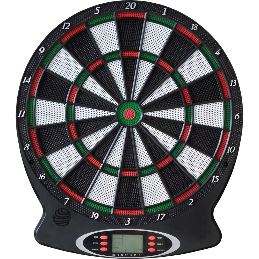 New Sports Elektronisches Dartboard mit Sound. Batterie betrieben (3x 1,5V AA nicht enthalten). Double und Triple sind Dreiloch-Felder. LCD Display, für bis zu 8 Spieler. 18 Spiele/159 Variationen. Zubehör: 6 Darts, 12 Ersatzspitzen, inklusive Spiel- und Bedienungsanleitung. Maße: 37,8x43x2cm. Für Kinder ab 14 Jahren.