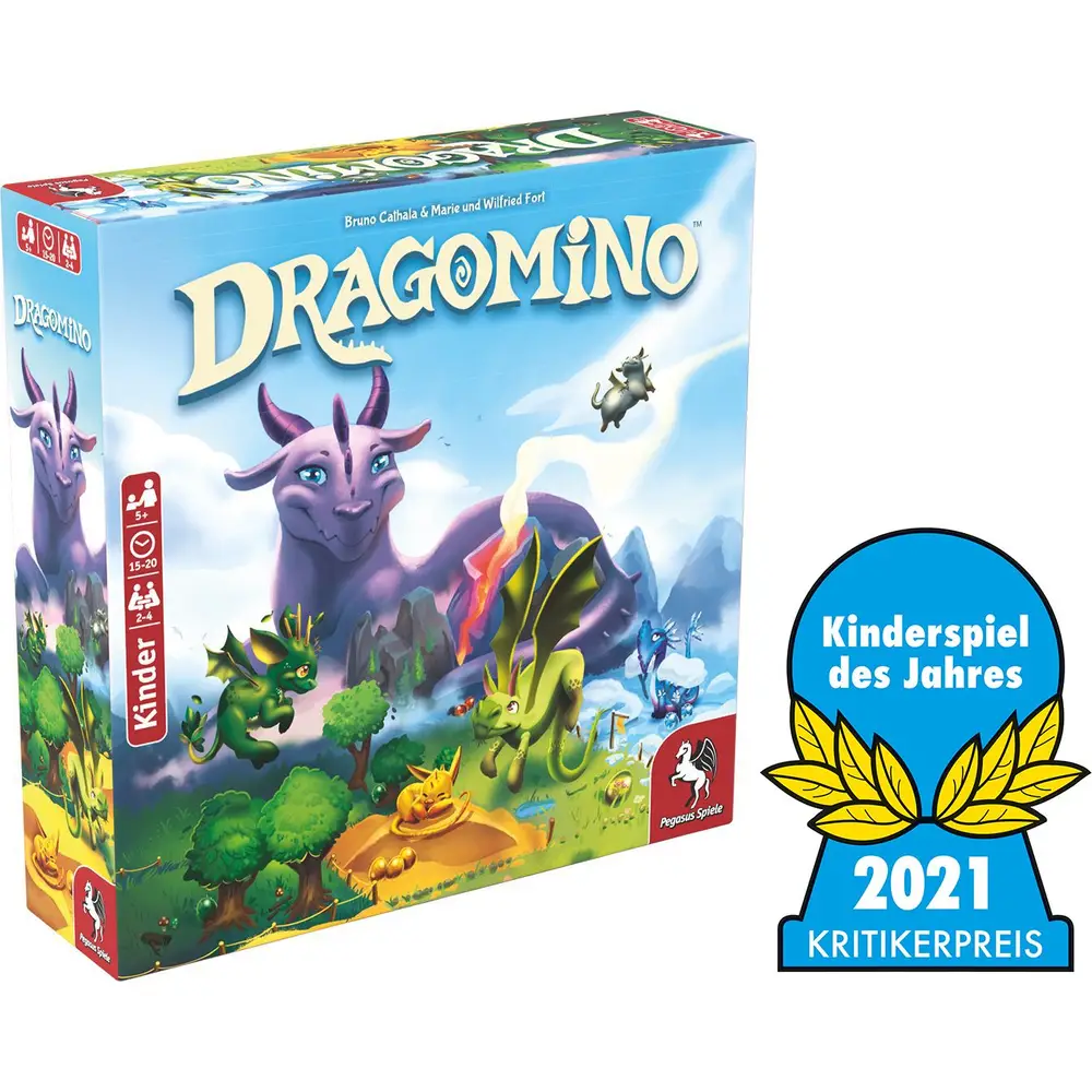 Als frisch ernannte Drachenforscher machen sich die Spieler bei Dragomino auf den Weg zu einer mysteriösen Insel. Ihr Ziel – möglichst viele süße Drachenbabys finden! Dazu erkunden sie Stück für Stück die Insel, dargestellt durch Dominosteine. Wann immer sie diese so platzieren, dass die abgebildeten Landschaften zusammen passen, entdecken sie ein Drachenei. Schlüpft daraus ein Baby, gibt es Punkte dafür. Ist das Ei leer, darf man in der nächsten Runde als Erster einen neuen Dominostein nehmen. Drachenbabysuche mit beliebtem Domino-Spielprinzip Nach und nach erkunden die Spieler die Insel mit bunten Dominosteinen Wer eine zusammenhängende Landschaft entdeckt findet ein Drachenei Eigenständige, kinderfreundliche Variante des Spiel des Jahres 2017, Kingdomino