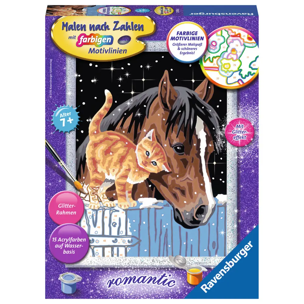 Ravensburger – Malen nach Zahlen: Fohlen mit Kätzchen. Dank der farbigen Motivlinien, welche die Malfelder umranden, können die Kinder das ganze Motiv und die benötigten Farben schneller erkennen. Zudem hat der Pinsel eine gute Führung. So entsteht nach und nach ein perfektes Bild. Am Ende stehen Freude, Stolz und ein Erfolgserlebnis, das die Lust am Weitermalen weckt. Der passende Bilderrahmen setzt das Kunstwerk in Szene. Eignet sich für Kinder ab 7 Jahren.