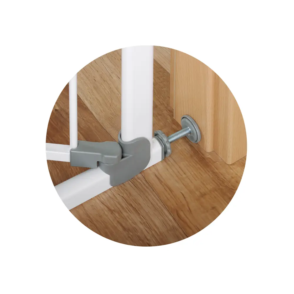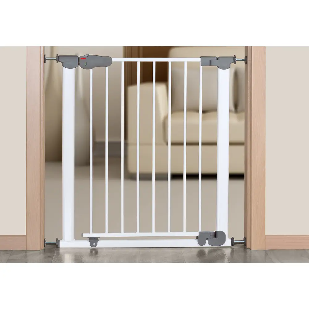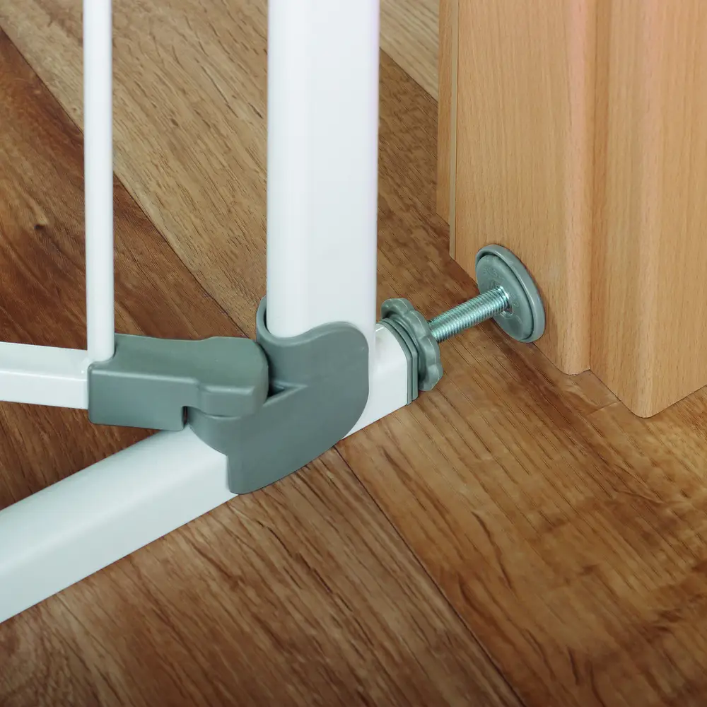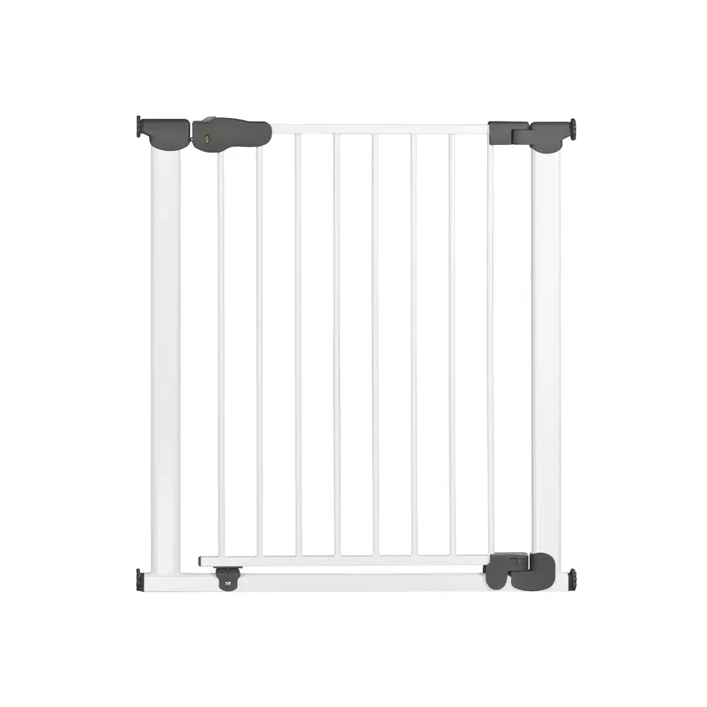 Montage ohne Bohren und Schrauben. Variable Gitterbreite, Stopper zur Begrenzung der Öffnungsrichtung im Lieferumfang enthalten. Material: Stahl, Kunststoff: POM, PA6, SEBS. Farbe: Rahmen und Tür weiß, Kunststoff hellgrau. Höhe 77 cm. Bis zu 24 Monaten.