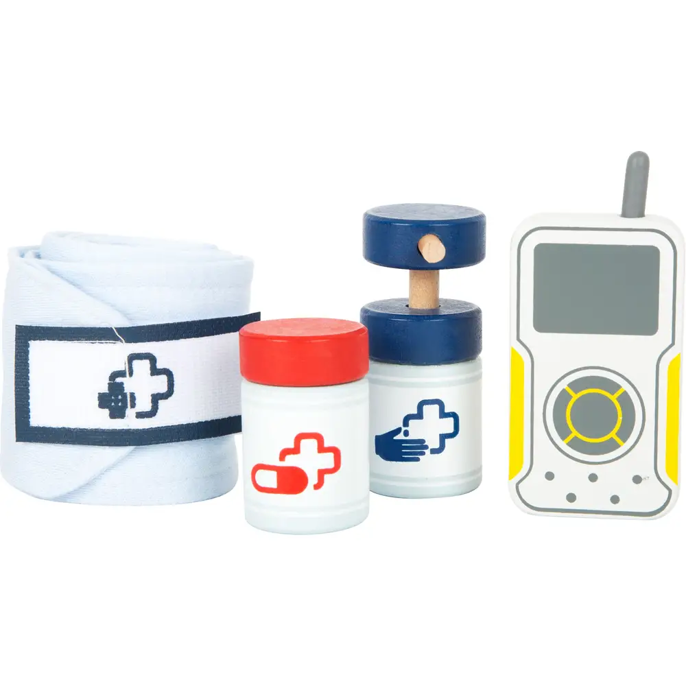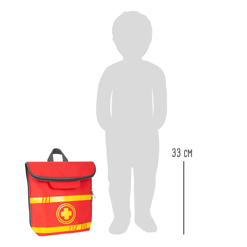 All-in-One für den Notfall! Mit diesem realistischen Rettungsrucksack in Signalfarben mit verstellbaren Riemen haben kleine Ersthelfer viele echte Utensilien aus dem Medizinbereich immer parat. Der doppelte Reißverschluss und Gummisteckplätze im Rucksack sorgen für Ordnung und schnellen Zugriff aufs Notfall-Equipment aus robustem Holz! Absolute Highlights des Notarzt-Spielsets sind das Blutdruckmessgerät mit Pumpball, das Otoskop mit echtem Vergrößerungsglas und der Defibrillator mit Tafelfeld! Ein innovatives, umfangreiches Notarzt-Set, das alles in einem praktischen Rucksack vereint, was Kinder fürs Arzt-Patienten-Rollenspiel brauchen! Zum Komplett-Set gehören neben Fieberthermometer, Kinderstoffmaske und Klemmbrett auch Notfallampulle mit Steckplatz für eine Spritze, Desinfektionsspray mit Drückmechanismus, Infusionsbeutel, Verband mit Klettverschluss, Tablettendose mit Schraubdeckel, Spritze mit Drückmechanismus, Salbentube, Stethoskop, Skalpell, Pinzette und ein Funkgerät. Mit den robusten und haptisch angenehmen Medizingeräten aus Holz können Kinder im Rollenspiel erkunden und üben, was im Notfall wichtig für eine Behandlung ist. Die Grafiken auf den Utensilien geben Hinweise, wofür diese im Spiel verwendet werden können. Ideal für unterwegs!