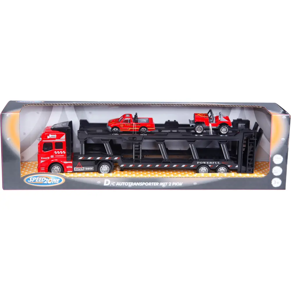 Speedzone D/C Autotransporter mit 2 PKW, 3-fach sortiert. Der Transporter ist mit Rückzug. Die Straßenfahrzeuge mit Freilauf. Länge ca. 33 cm. Für Kinder ab 3 Jahren.