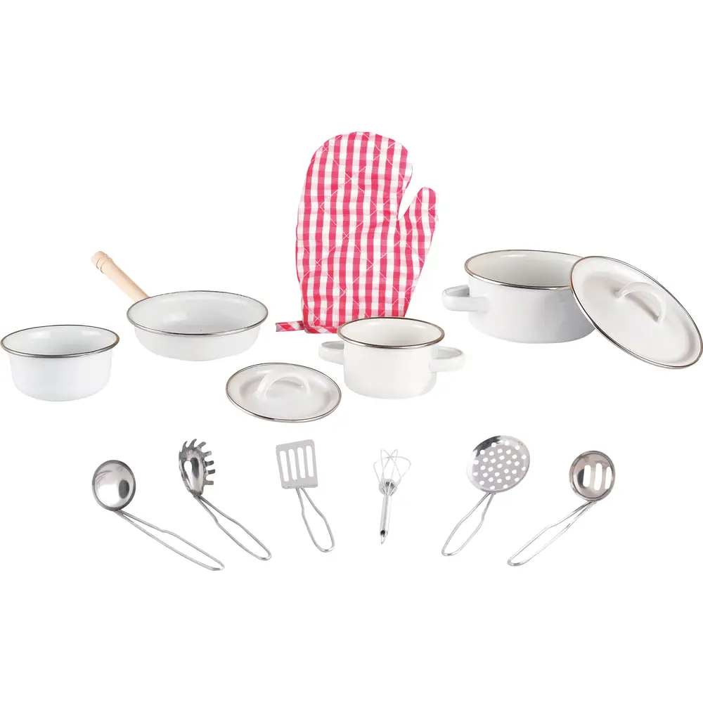 Spielmaus Küche Spiel-Kochtopf-Set, 13-teilig. Das Set beinhaltet Töpfe, Pfanne, Backhandschuh und viele weiteren Küchenhelfer. Für Kinder ab 3 Jahren.