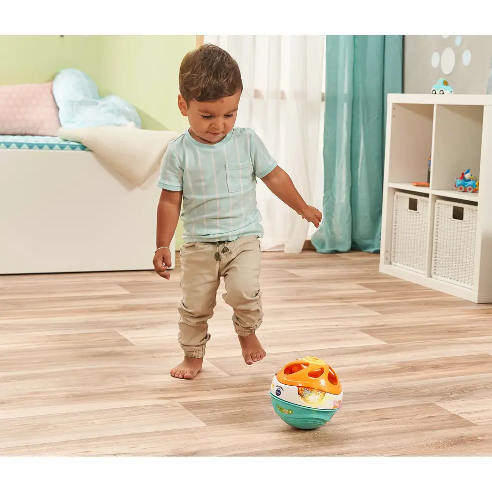 Magischer Musikball, der sich von allein bewegt! Interaktiver Ball aus 3 beweglichen Teilen, der dank seines integrierten Motors lustig rollen kann und das Kind zur Bewegung animiert. Drei Spielmodi: 1) Ball-Modus: Der Ball rollt im Kreis und spielt tolle Musik. 2) Roll-Modus: In wenigen Handgriffen lässt sich der Ball in eine sanduhrförmige Rolle verwandeln, die rasant hin und her fährt. 3) Trommel-Modus: Der Ball kann als Trommel verwendet werden die Tasten und die Oberfläche reagieren auf Berührung. 3 leuchtendee LED-Tasten, die lustige Sätze, Geräusche und Musik auslösen. Lerninhalte: Zahlen und Farben. 4 gesungene Lieder und 12 Kindermelodien. Kindersicheres Batteriefach und Abschaltautomatik. Demobatterien sind enthalten